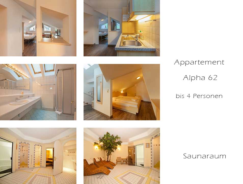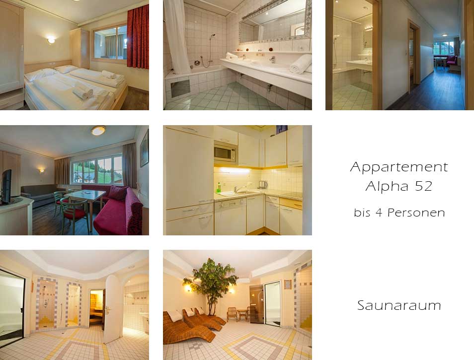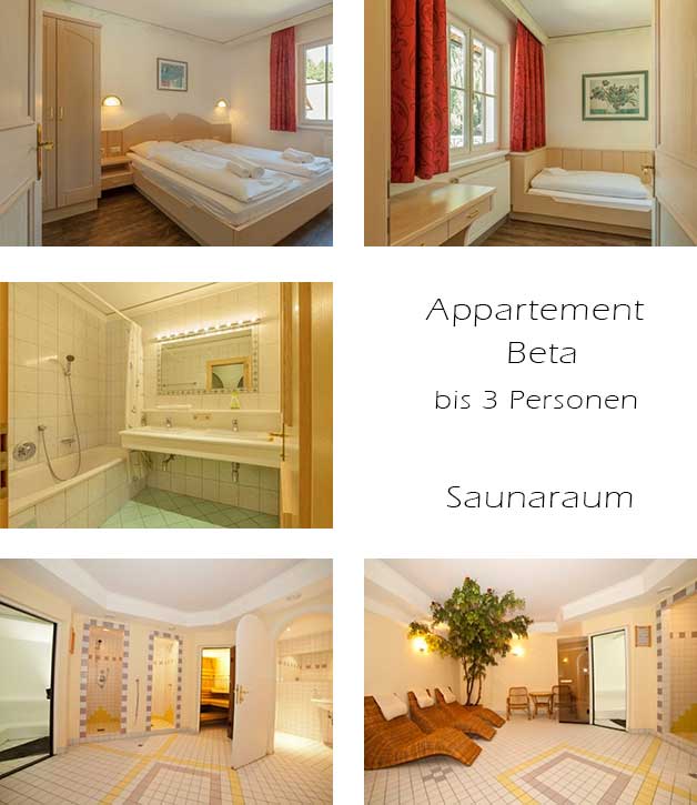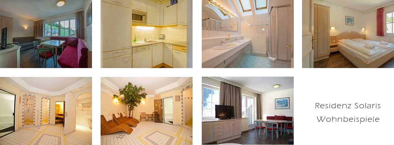 Die Residenz Solaris verfügt über zehn Appartements für drei bis sechs Personen. Die freundlichen Räume und die gute Ausstattung der Appartements machen das Wohlfühlen leicht. Alle Appartments sind funktionell und feriengerecht eingerichtet.Das gesamte Appartementhaus wurde im Herbst 2016 umfassend renoviert. Im Haus stehen ein Skikeller mit Skischuhtrockner sowie ein Wellnessbereich mit kleiner Sauna, Dampfbad und Ruhebereich zur Verfügung. Appartement Sigma für 3 Personen offener Wohnschlafbereich für 3 Personen (Doppelbett und Schlafcouch), Essecke, separate Küchenzeile, Bad mit Doppelwaschbecken und Badewanne, separates WC. Beispielbilder hier klicken Appartement Alpha 52 für 4 Personenca. 52 qm, 1 x Doppelzimmer mit Fenster zum Wohnraum, Wohn-/Schlafraum mit Doppelcouch und Essecke, offene Küche, Bad mit Doppelwaschbecken und Badewanne, separates WC. Bilder hier klicken Appartement Alpha 62 für 4 Personen ca. 62 qm, offener Wohnschlafbereich für 4 Personen (Doppelbett und Schlafcouch), offene Küche mit Essbereich, Bad mit Doppelwaschbecken, Dusche und WC. Bilder hier klicken Appartement Beta für 3 Personen, mit Balkon ca. 47 qm, 1 x Doppelzimmer, 1 x Einzelzimmer, Bad mit Doppelwaschbecken, separates WC, offene Küche, Balkon. Bilder hier klicken Selbstverpflegung.