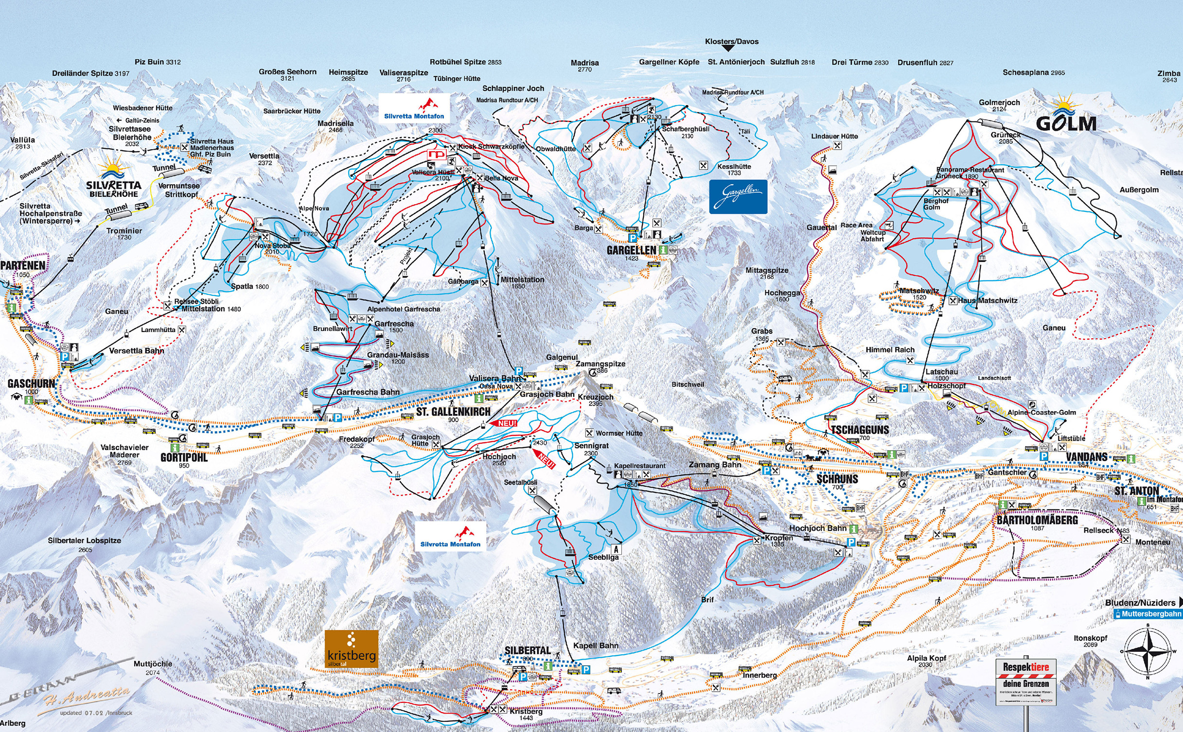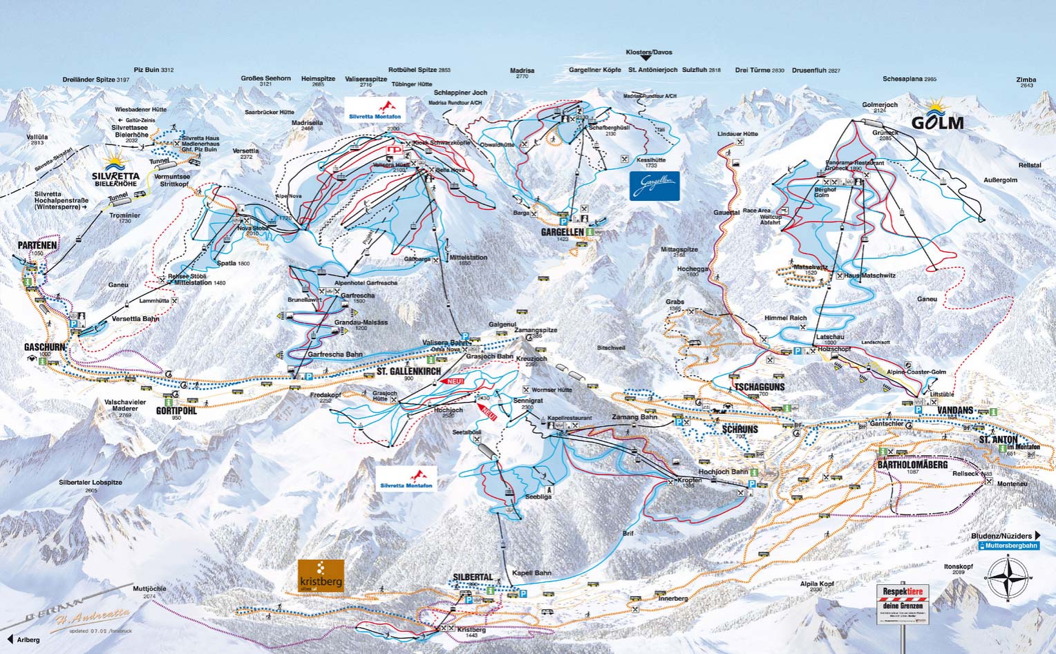 Silvretta Montafon Pisten: 140 km Skilifte: 37 Golm Pisten: 36 km Skilifte: 9 Gallen Pisten: 33 km Skilifte: 8 Kristberg Pisten: 8 km Panoramaloipe: 11 km Skilifte:3 Silvretta-Bielerhöhe Pisten: 2 km Skilifte: 2 Auch im Winter gibt es in den Skigebieten kein Gedränge - 218 km markierte Abfahrten verschiedenster Schwierigkeitsgrade sorgen für eine ideale Verteilung der Freunde des weißen Sports. Skipass