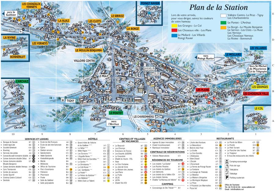 Der bei Radsportfreunden bekannte Ort Valloire liegt im Maurienental, ca. 90 km von Chambéry, 440 km von Basel entfernt. Im Gegensatz zum benachbarten Valmeinier ist Valloire ein gewachsener Skiort mit dem Flair eines charmanten Bergdorfes.Hübsch eingebettet in einen Talkessel unterhalb des Col du Galibier bietet Valloire fantastische Ausblicke in eine bizzare Bergwelt. In aufgelockerter Form gruppieren sich Hotels und Ferienresidenzen um die barocke Kirche aus dem 17. Jahrhundert. Bekannt ist Valloire für den alljährlichen, internationalen Wettbewerb der besten Eisbildhauer, in dessen Verlauf innerhalb weniger Tage beeindruckende Eisskulpturen entstehen. Ein Einkaufsbummel durch Valloire lohnt sich, eine Vielzahl an Geschäften bietet die neueste Skimode, leckere französische Spezialitäten, daneben locken viel Bars und Restaurants zum verweilen oder die französische Küche ausgiebig zu testen. Ortsplan von Valloire. Anreise: Autobahn Bern – Genf – Chambéry – Aiguebelle, weiter auf der A 43 bis St. Michel de Maurienne, von hier noch 17 km Bergstraße. Skigebiet