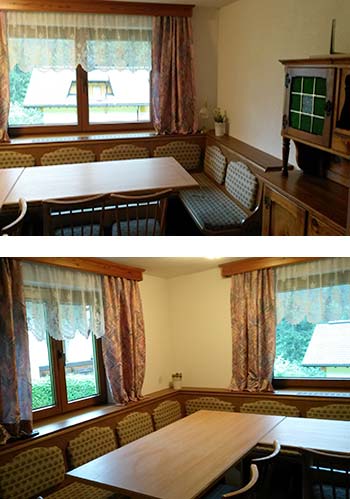 Selbstverpflegung. Im Haus befinden sich zwei voll ausgestattete Küchen: im Erdgeschoss mit 4-Platten-Cerankochfeld, Backrohr, Kaffeemaschine, Wasserkocher und Kühl-/Gefrierkombination und im Dachgeschoss mit 4-Plattenherd, Backrohr, Kaffeemaschine, Wasserkocher und Kühlschrank. Geschirr, Töpfe und Besteck sind in ausreichender Anzahl vorhanden. Lage